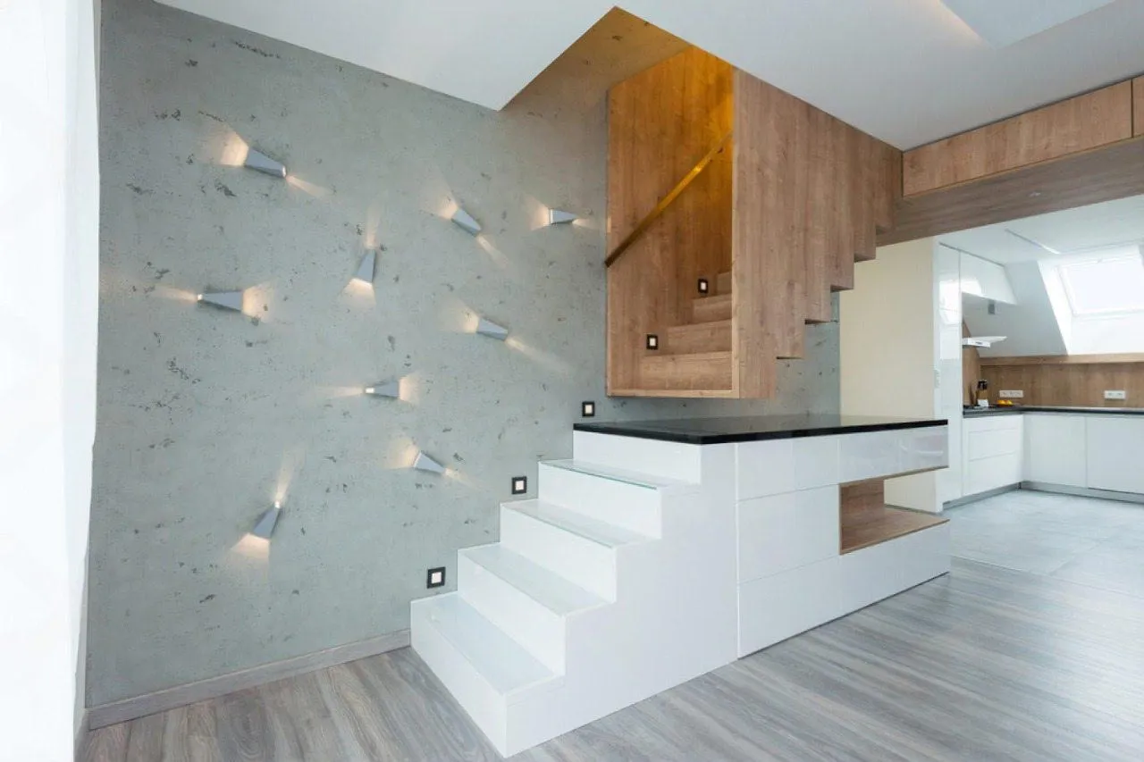 Идея для вашей лестницы: Рассмотрите возможность встроить в стену вдоль лестничного марша точечную светодиодную подсветку. Мягкий направленный свет не только повысит безопасность в темное время суток, но и эффектно подчеркнет красивую текстуру деревянных ступеней.